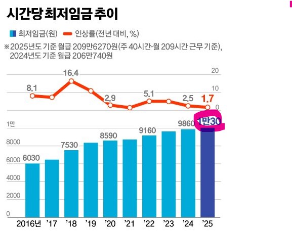 최저임금위원회의 발표에 따르면, 2025년도 최저임금은 올해보다 1.7% 인상된 시간당 1만30원으로 결정되었습니다.