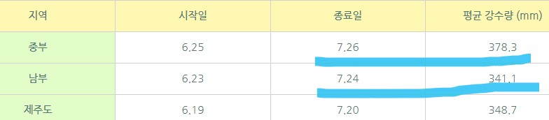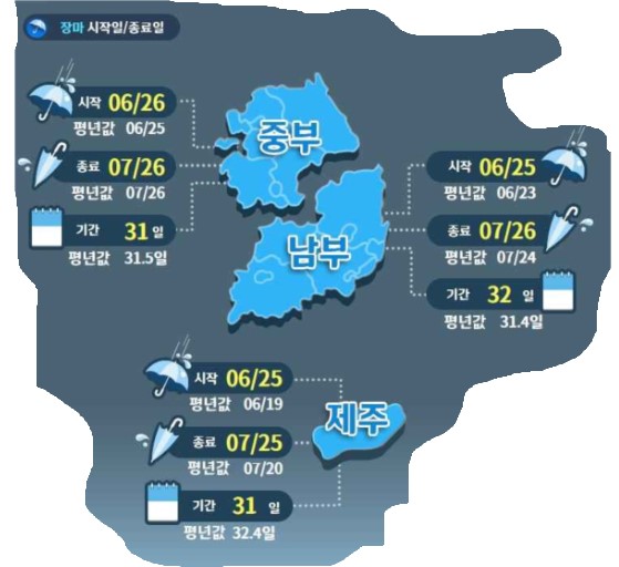 평균 장마기간은 약 한 달이니, 이 기간 동안은 외출 시 우산이나 비옷을 항상 챙기시는 것이 좋겠습니다.