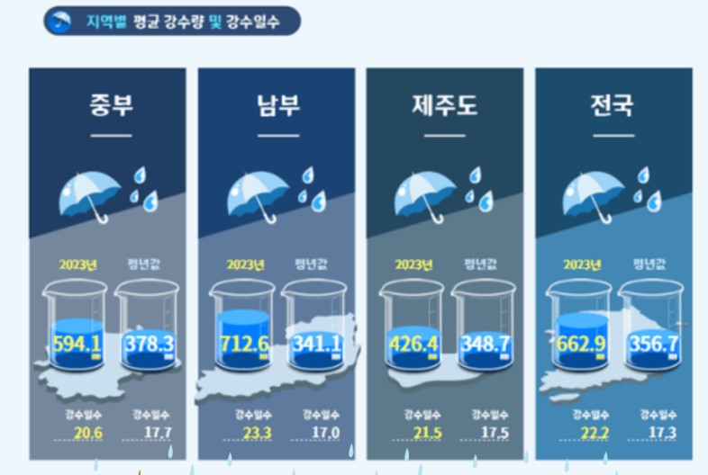 중부지방의 평균 강수량이 가장 많을 것으로 예상되니, 이 지역에 거주하신다면 집 주변의 배수 시설을 점검하시는 것이 좋겠어요.