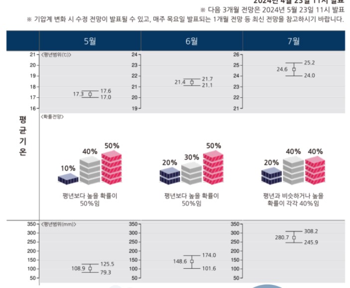 기상청 예보에 따르면, 6월 강수량은 평년과 비슷할 확률이 50%이고, 7~8월은 각각 평년보다 많을 확률이 40%로 나타났어요.