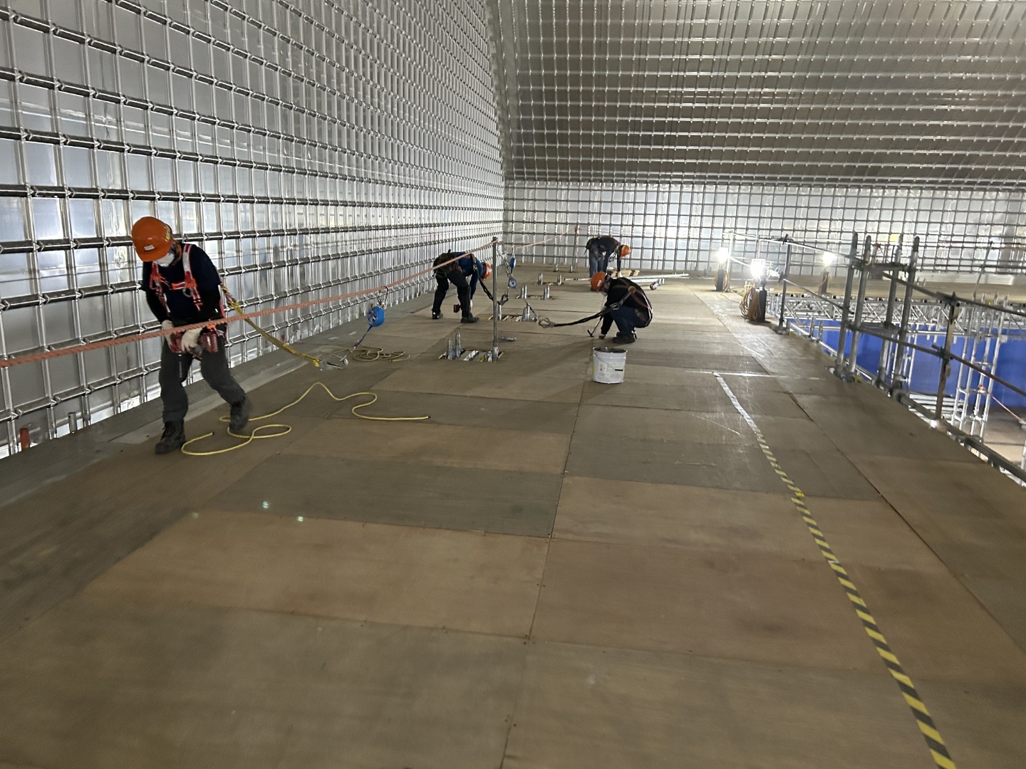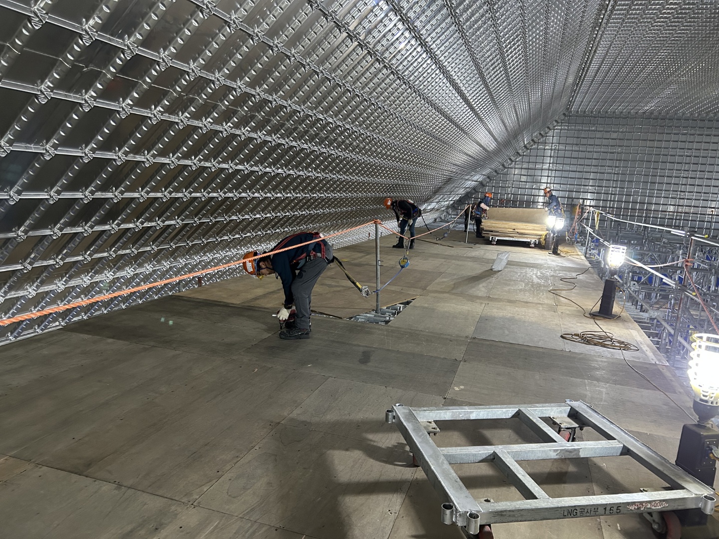 트러스 구조물의 해체와 동시에 진행되는 클리닝 작업은 철저한 먼지 제거를 목표로 합니다. 이는 멤브레인의 손상을 방지하고 선박 내부의 청결을 유지하기 위함입니다. 클리닝 팀은 작업자들이 해체한 부분을 즉시 청소하여, 먼지나 잔여물이 다른 구역으로 퍼지는 것을 방지합니다. 이러한 작업의 병행은 시간 절약은 물론 효율적인 작업 진행을 가능하게 합니다.